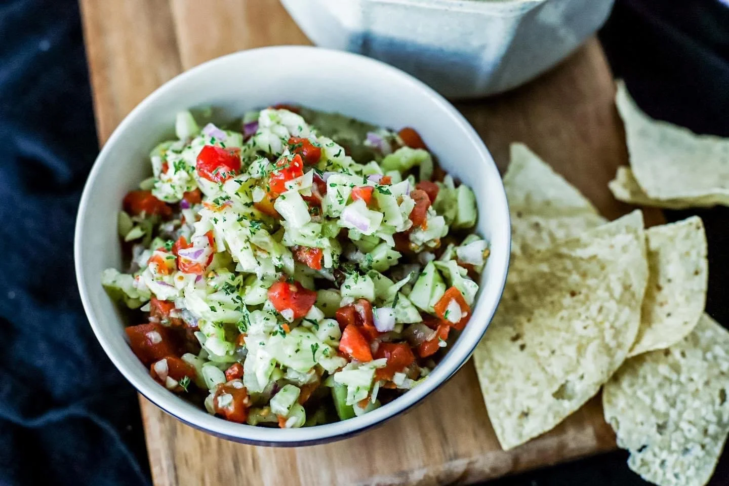 Combine all ingredients in large bowl. Cover and let chill for a couple of hours before serving. We do recommend draining the rotel because the cucumbers will produce liquid after sitting in the fridge. Serve with tortilla chips.